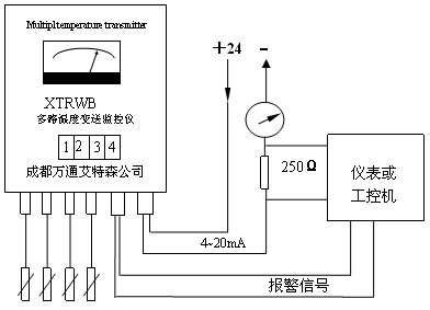 XTRWB是多路输入,一路4~20mA二线制输出的温度变送监控仪,它安装在靠近被测量点,二线制输出同时作为信号和仪表的供电电源线。