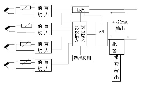 来自热电阻的测量信号通过前置放大器放大,然后被比较输入电路(选择高温信号)或选点输入电路选中当前温度最高的一路信号,该信号通过电压/电流(V/I)转换电路将放大器的输出电压变为4~20mA恒定电流输出。
